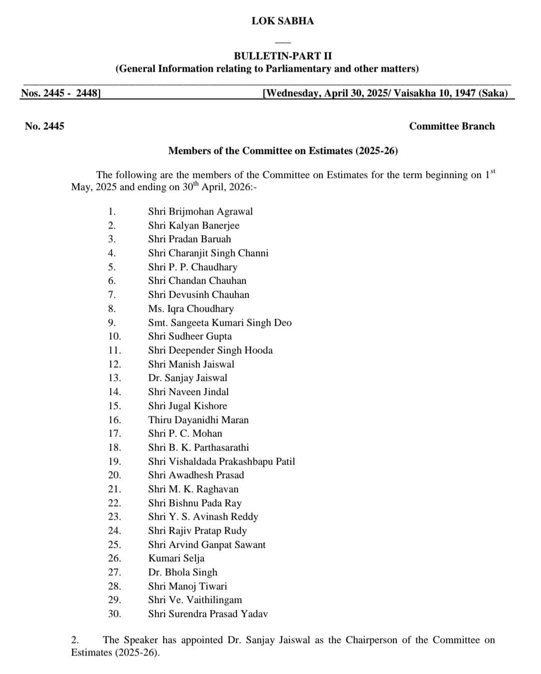रायपुर सांसद एवं वरिष्ठ भाजपा नेता बृजमोहन अग्रवाल को संसद की एक महत्वपूर्ण समिति Estimates Committee का सदस्य नियुक्त किया गया है। लोकसभा अध्यक्ष ओम बिरला ने इस समिति के गठन की घोषणा की है, जिसमें श्री अग्रवाल को सदस्य के रूप में शामिल किया गया है।