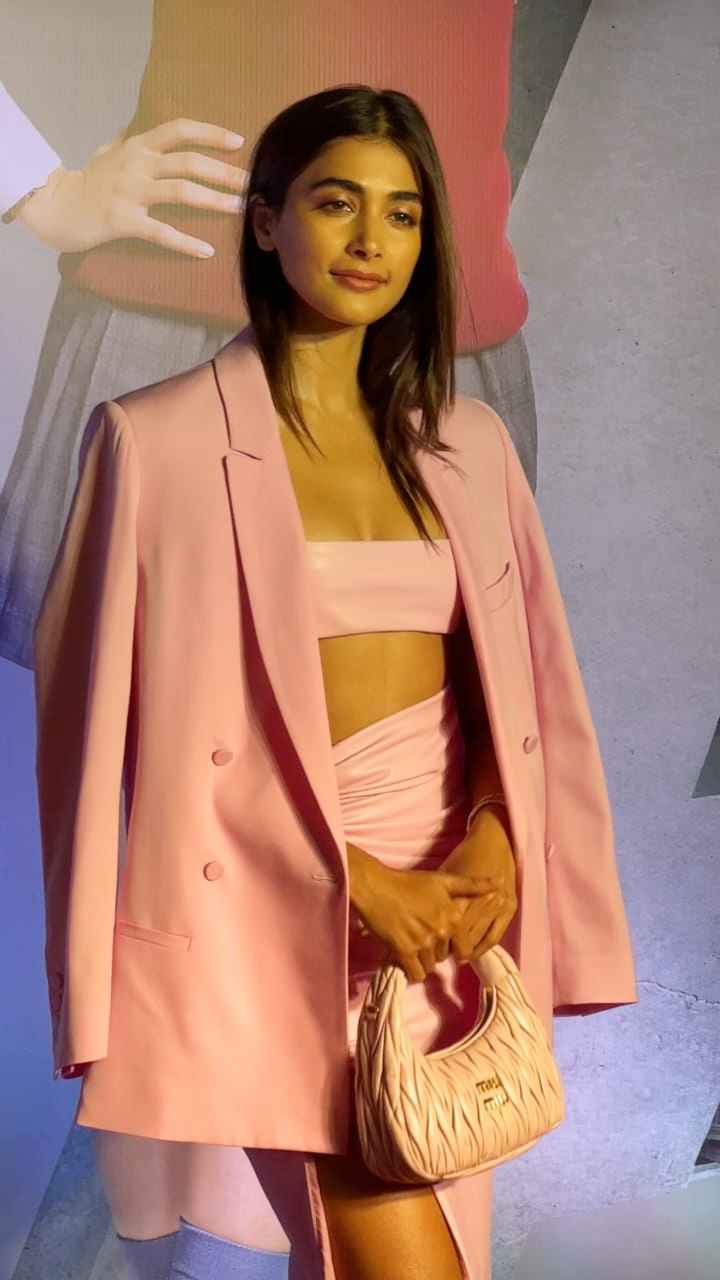 पूजा हेगड़ी बेबी पिंक कलर की स्टाइलिश ड्रेस पहन अलिजेह अग्निहोत्री की फिल्म स्क्रीनिंग का हिस्सा बनी थीं.