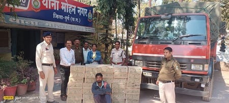 इसी क्रम मे मुखबीर की सूचना मिलने पर थाना मोहन नगर , एसीसीयु टीम दुर्ग एवं आबकारी विभाग दुर्ग टीम के संयुक्त धमधा रोड दुर्ग सब्जी मंडी थाना मोहन नगर जिला दुर्ग में वाहन टाटा माजदा क्रमांक CG 08 AU 0756 में अवैध रूप से शराब का पेटी भरा हुआ खडा हुआ है कि बताये अनुसार घटना स्थल धमधा रोड सब्जी मंडी दुर्ग पहुचकर देखा तो वाहन टाटा माजदा क्रमांक CG 08 AU 0756 में एक व्यक्ति ड्राईवर सीट में गाडी को छुपाव हासिल कर बैठा था जिसे घेराबंदी कर नीचे उतारकर नाम पता पूछने पर अपना नाम लखन भैसा पिता जोहरी भैसा उम्र 38 साल बेडगांव थाना बेडगांव जिला गढचिरौली महाराष्ट्र का रहने वाला बताया तथा वाहन में शराब भरा होना पाया। जिसमे देशी मदिरा प्लेन 81 पेटी कीमती करीब 3,00,000 रूपये तथा वाहन टाटा माजदा क्रमांक CG 08 AU 0756 कीमती करीब 08 लाख रूपये कुल जुमला 11,00,000 रूपये को बरामद कर बरामदगी किया गया ।
