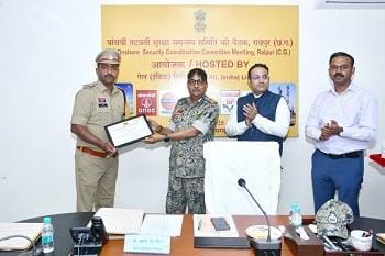 दुर्ग/ निरीक्षक मनीष शर्मा थाना प्रभारी थाना नन्दिनी जिला दुर्ग को दिनांक 23/05/2025 को पुलिस मुख्यालय नया रायपुर में Onshore security Co-ordination committee की आयोजित मीटिंग में पुलिस महानिदेशक महोदय की अध्यक्षता में सम्मान किया गया।